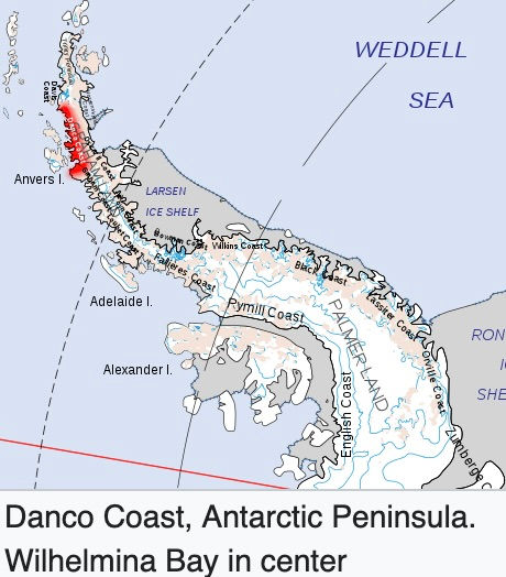 The Bay is on the Danco Coast on the west side of the Antarctic Peninsula