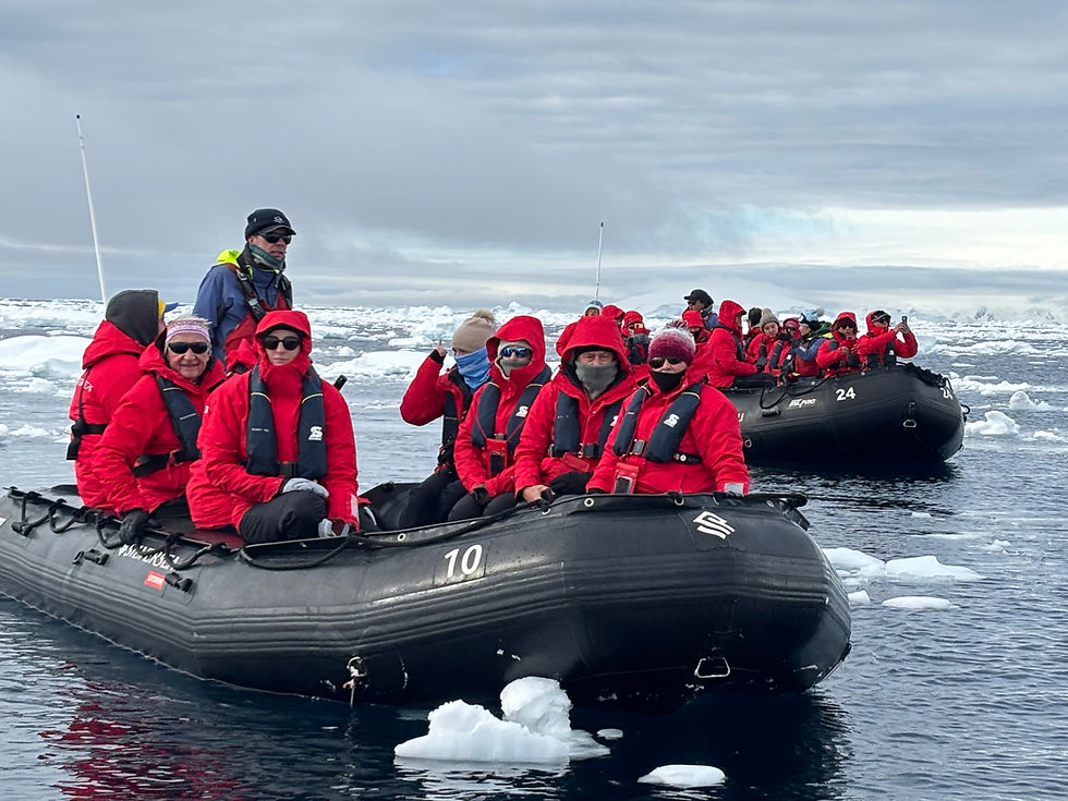 Heavily bundled up with several very warm layers, and also protected from the freezing drizzly rain or powdered snow by Silver Sea Expedition's Red parka a group of 8 of us, were huddled into the slippery zodiac. I hardly kept my balance when stepping down into the boat, in which we kept getting, slowly but surely, frozen, during the this polar boat tour.