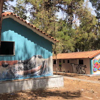 The scattered empty army-like barracks structures are stripped off doors and windows, and left with only graffiti decorating them.